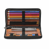 Das Sonnenleder Stifteetui Novalis bietet Platz für 14 Füllhalter, 12 Schreibgeräte oder Zubehör und ein Lineal bis zu 17 cm Länge. Zusätzlich gibt es Schlaufen für Radierer und Spitzer. Das Etui ist durch einen Reißverschluss verschließbar und jedes Stück ist ein Unikat. Farb- und Strukturabweichungen sind möglich.