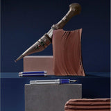 Genießen Sie das höchste Schreibvergnügen mit dem Graf von Faber-Castell Füller, Pen of the Year 2024, Ottomann, Limited Edition, 18KT, Blau. Die 18-Karat Magnum Bicolor Goldfeder in den Federbreiten M, F und B sorgt für butterweiche Präzision. Der innovative Kolbenmechanismus, aktiviert durch Abschrauben des Schafts, offenbart eine kunstvoll dekorierte Innenhülse.